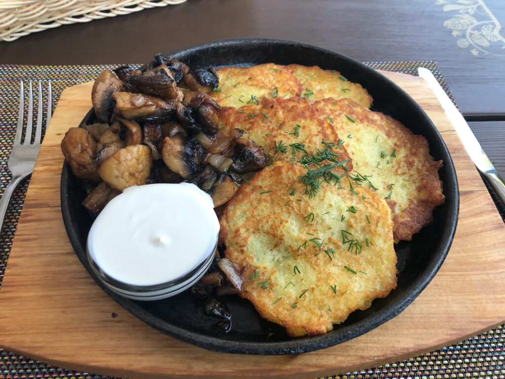 The national dish is draniki, potato pancakes, either plain or stuffed. Boršč is also very common, with or without meat. Most restaurants serve Russian dishes. Belorussians don’t eat much meat as it’s fairly scarce and expensive so finding vegetarian food is not hard; they will be a little bemused that a visitor doesn’t want the meat dish. Often you’ll need to ask for the local menu rather than the foreigner one.