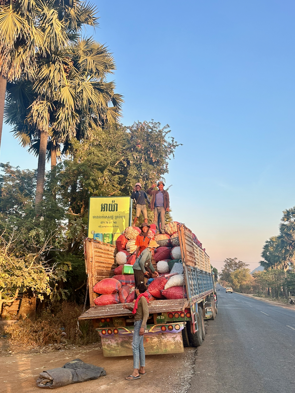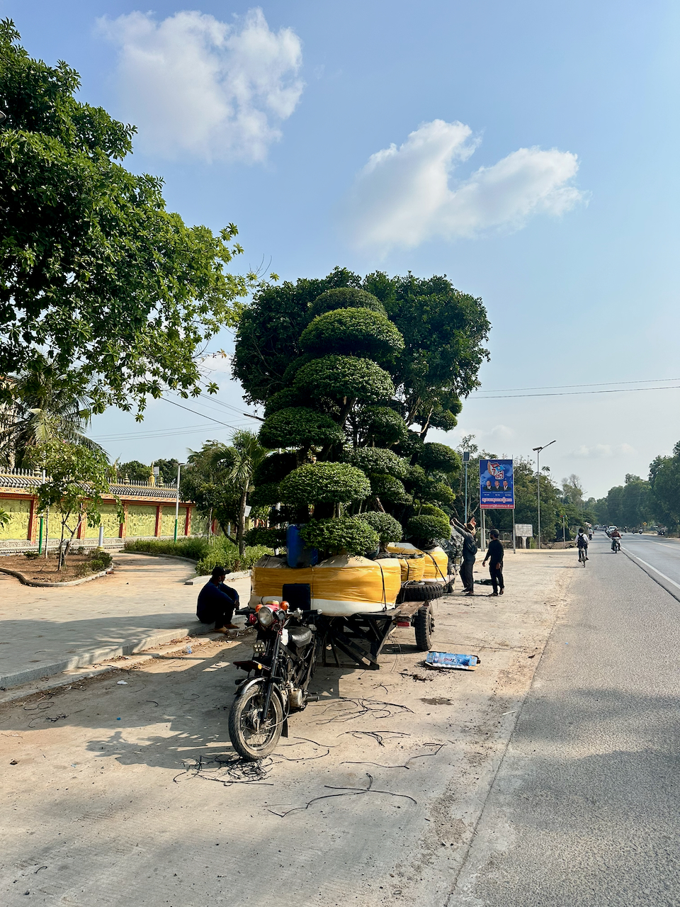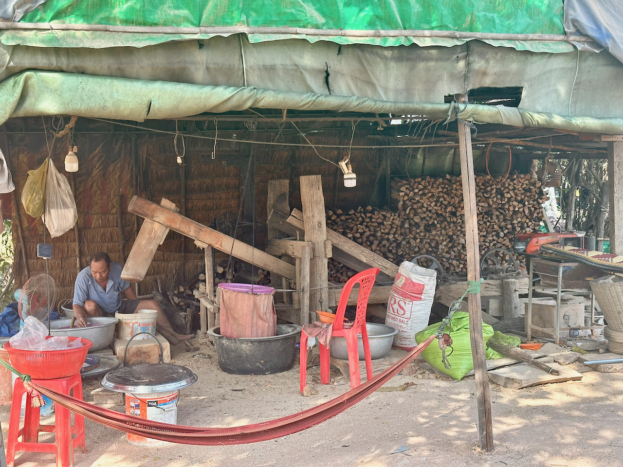 The road to Siem Reap, the city next to Angkor Wat, is flat and long. Cambodian countryside, where not cultivated, is scrubby grassland with sparse trees, pleasant to cycle through, not especially photogenic. There are a lot of villages along this road to the point where they merge into one another without a break. One place has many of the contraptions shown below, a device for pounding something and shaking something else; there are many of them in a single village, making quite a racket, and none anywhere else.