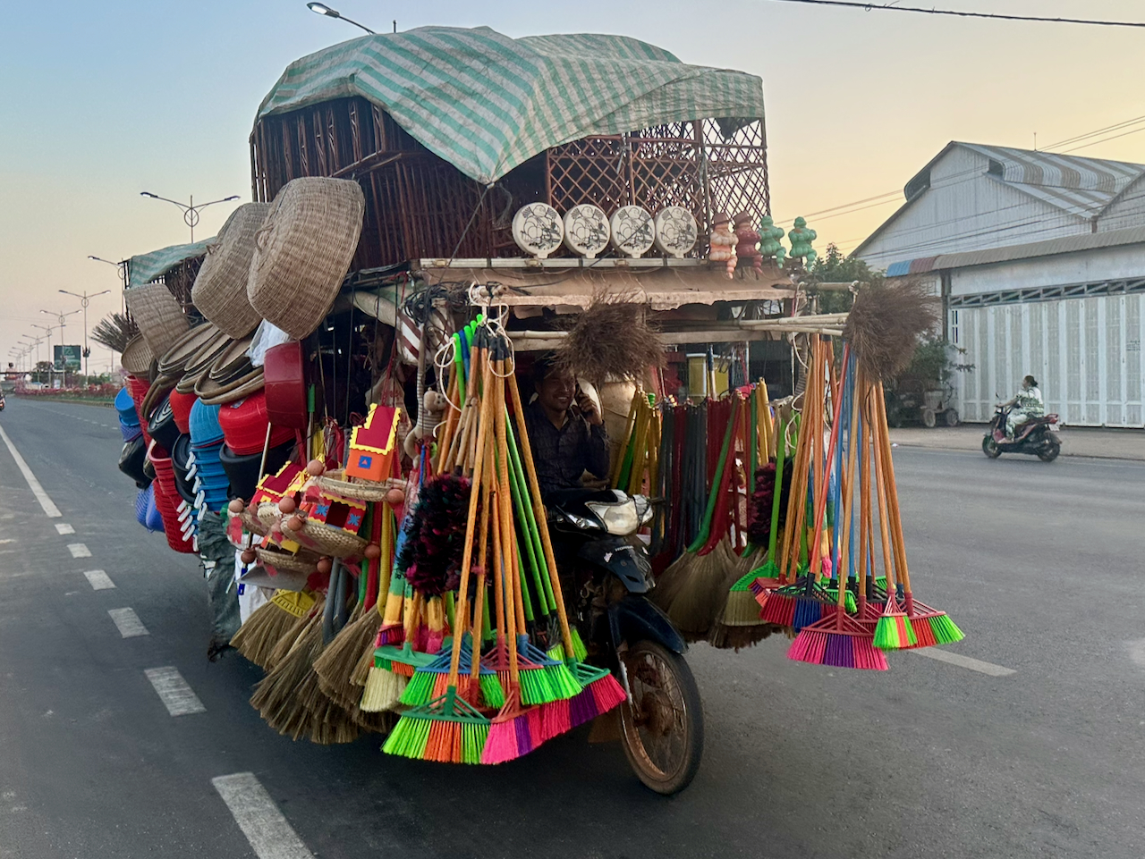 The Cambodian border at Bavet, a 10 km ride, is remarkably efficient, despite needing to attend multiple windows for various bits of paper and stamps. The other side is chaos and a smelly, dirty mess compared to Vietnam. This is just the border region, it gets better, but on crossing I’m confronted with a wall of thick smog, traffic jams, trash everywhere and nothing but casinos (gambling is illegal in Vietnam). There’s also no money changers, maybe they’re not allowed here, after a few attempts I’m told “Chi Phu”, a town 15 km inside the border. I find an ATM but it gives me US dollars. But yes, it turns out that in Chi Phu, changing money is no problem. I still don’t understand.
