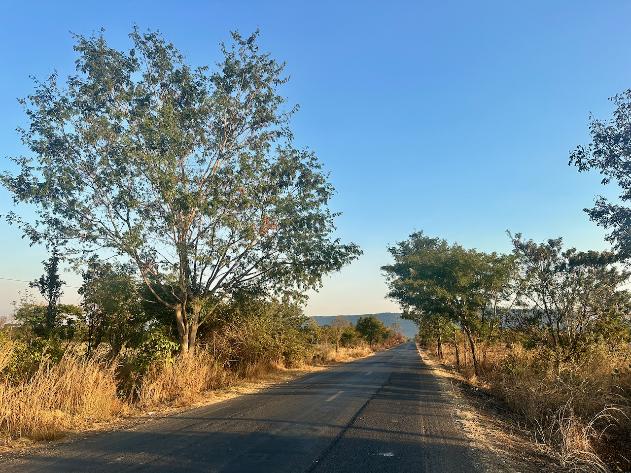 There are many fires along the side of the road, and bigger ones further out. This is cassava growing region, they burn down an area, killing most of the trees, and grow cassava for a couple of seasons. After which the soil is spent, and they move on to a new area. All the villages are involved in cassava processing, with people cutting up the roots to dry out on the hard shoulder, cutting machines driving between the villages, and ultimately massive lorries full of the dried produce.