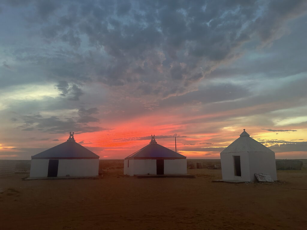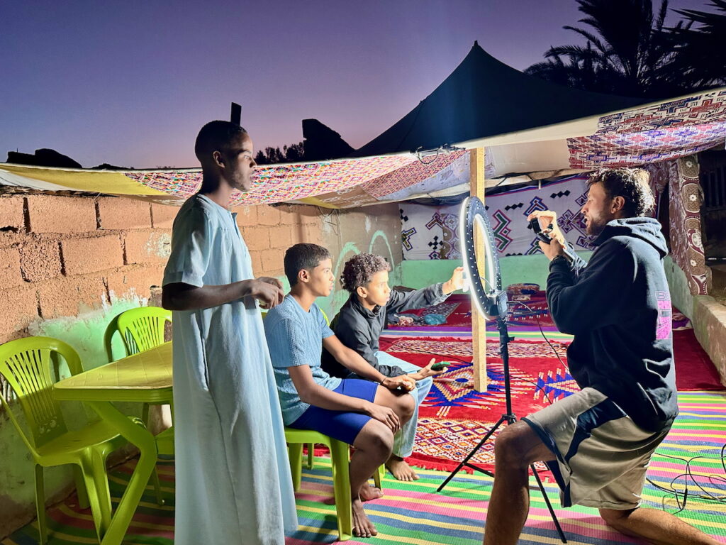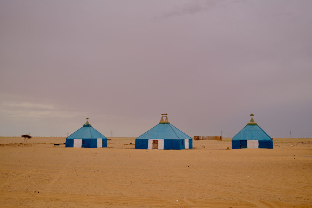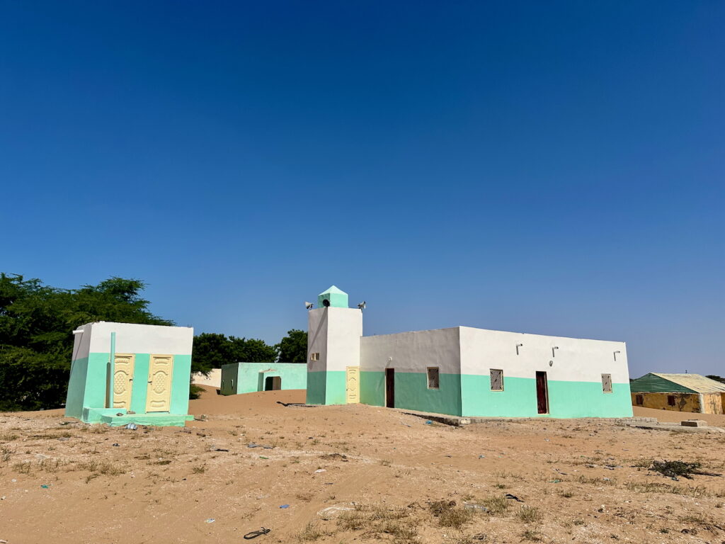 The iOverlander app shows just two places to stay here, an Auberge described as dilapidated and beyond filthy and a hotel which is out of Luca’s budget, but also described as extremely basic. Maloud tells us there’s a camp site not on the map and a bunch of children appear to show us the way. This turns out to be a small compound full of palm trees, a set of traditional square tents, some with sides, all with sleep mats, and even a swimming pool (which admittedly looks pretty toxic). Luca negotiates the price down from 300 to 200 ougiya, about £4 each.