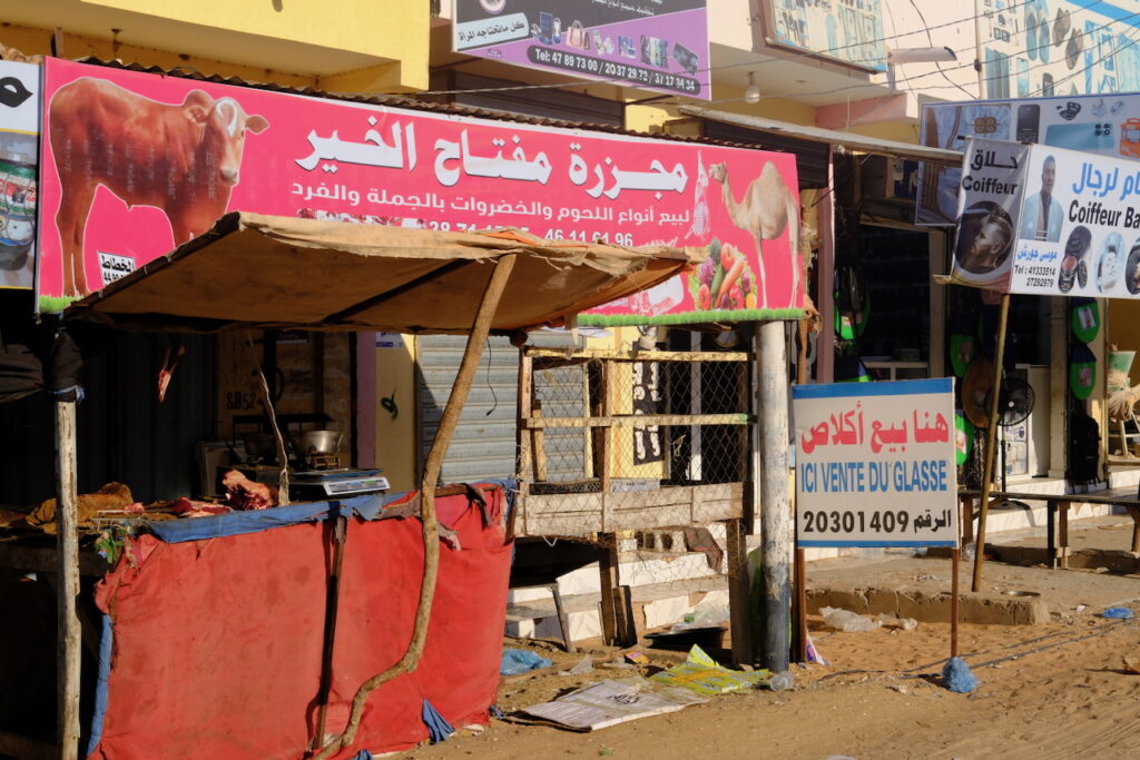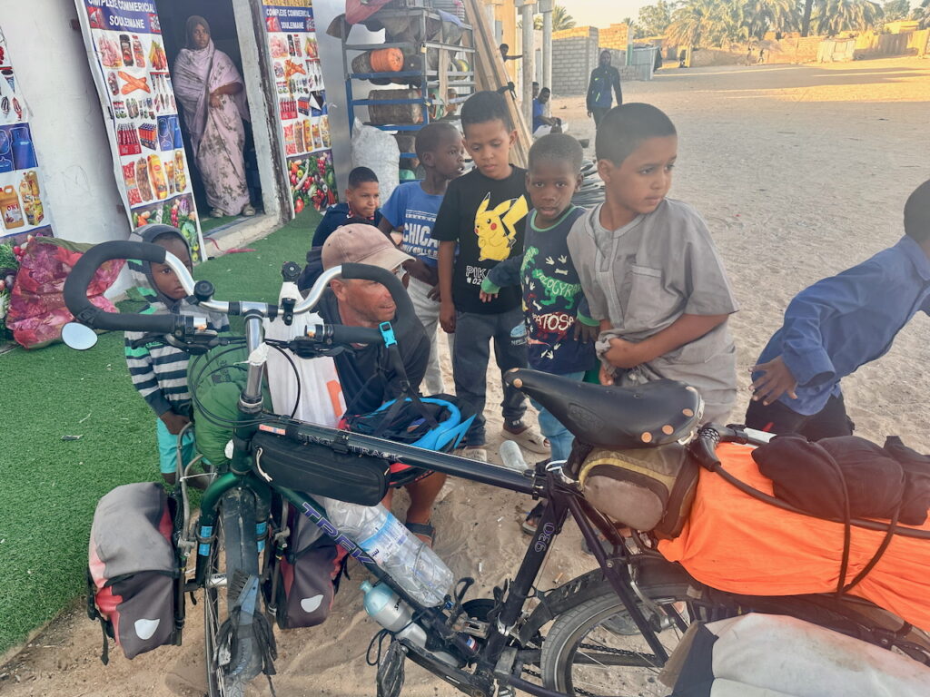 There are shops in huts along the main road, and on approaching the most likely looking one for a cold drink I’m welcomed by the owner, Maloud, like an old friend. He insists I sit with him in the shade of the awning and take tea and we communicate in a mixture of French, English and Spanish. There’s also a couple of Californian hitch-hikers in the shade of the next hut, and Maloud gets someone to make food for us all. Luca arrives about an hour later, just as the Californians get a ride to Nouakchott.