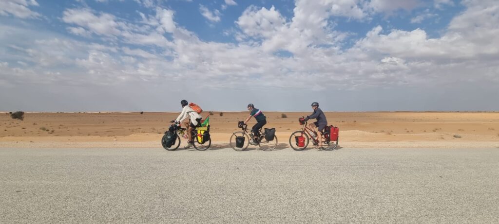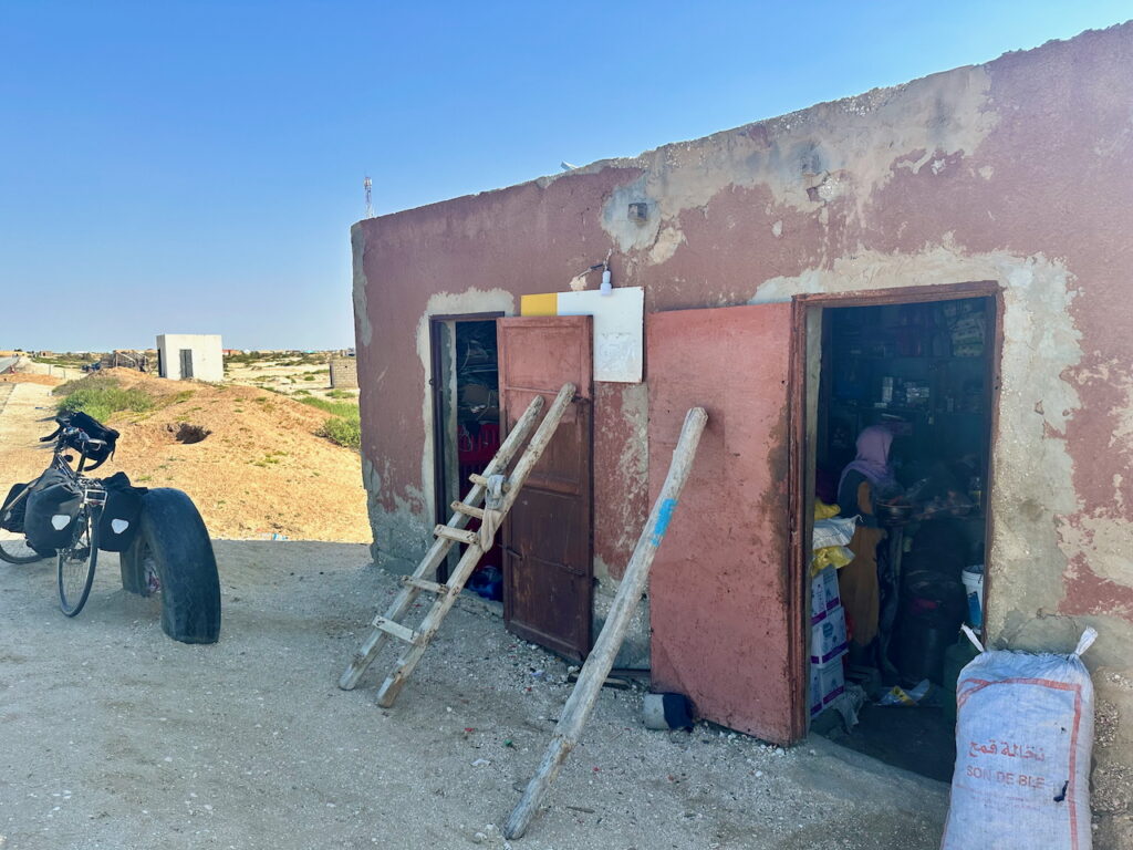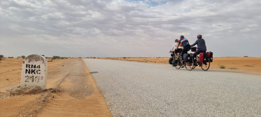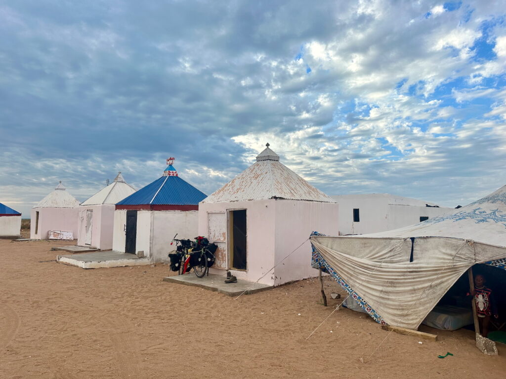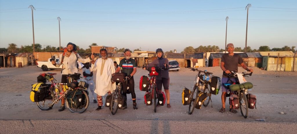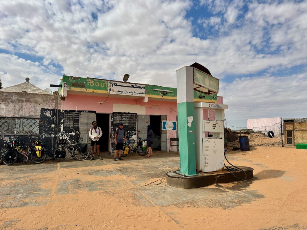 Villages are few and far between, but there are occasional tiny shops, and one petrol station (no petrol available, there are only diesel cars here) which has some food which only Leo eats. Luca prefers to cycle at his own pace and wild camp, the other four of us push on to Chami at 150 km away. The wind turns against us and there’s even some rain, we arrive at Chami just before dark feeling pretty tired. I choose to stay in the hotel for 1500 MRU (€30) while the others decide to sleep on the floor of the restaurant after it closes. Apparently this is normal.