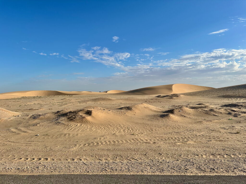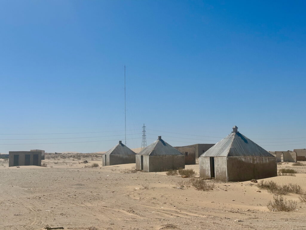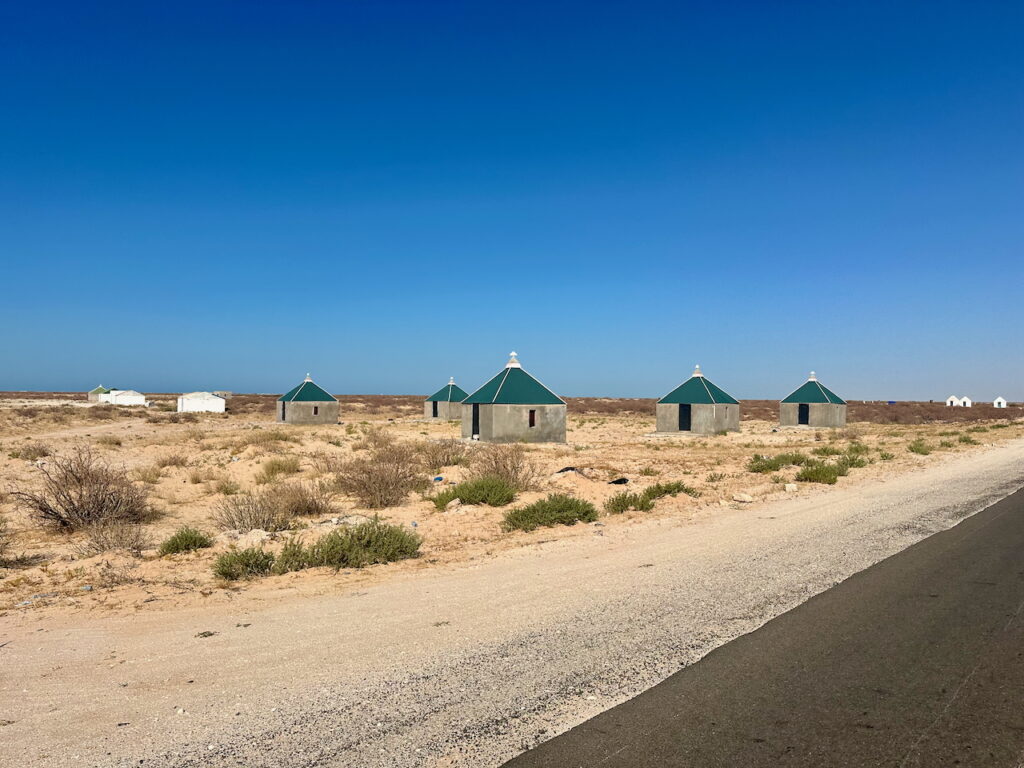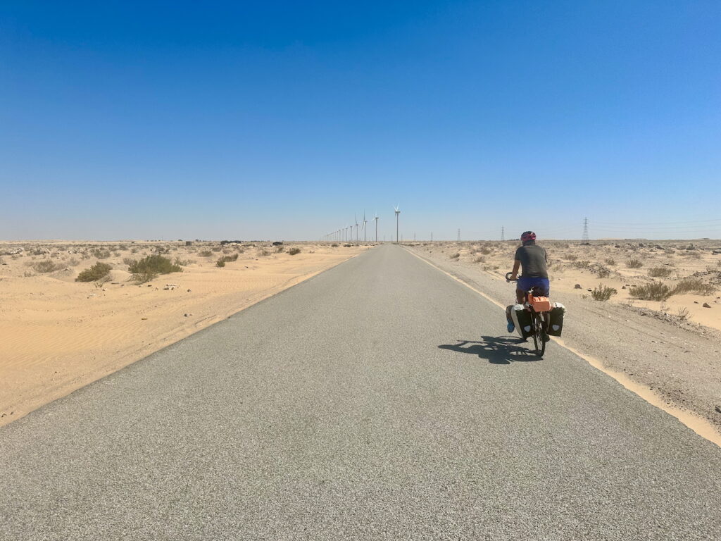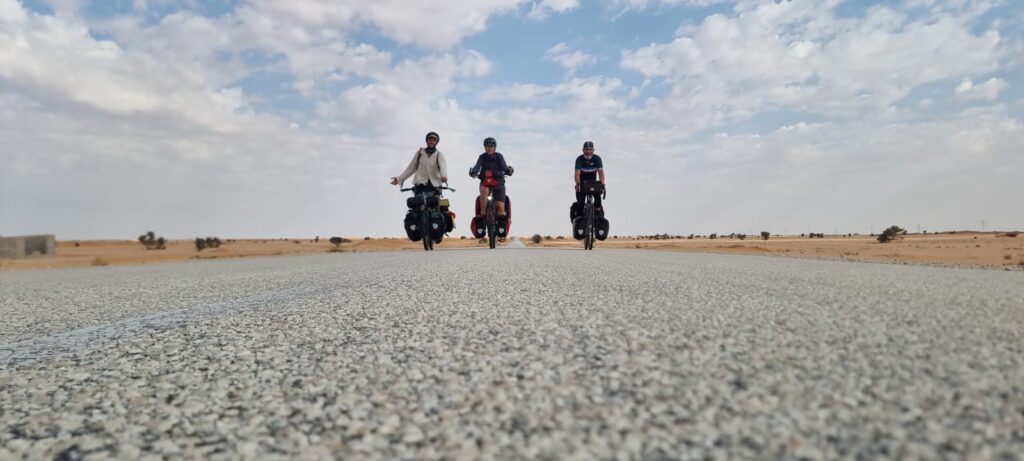 Villages are few and far between, but there are occasional tiny shops, and one petrol station (no petrol available, there are only diesel cars here) which has some food which only Leo eats. Luca prefers to cycle at his own pace and wild camp, the other four of us push on to Chami at 150 km away. The wind turns against us and there’s even some rain, we arrive at Chami just before dark feeling pretty tired. I choose to stay in the hotel for 1500 MRU (€30) while the others decide to sleep on the floor of the restaurant after it closes. Apparently this is normal.