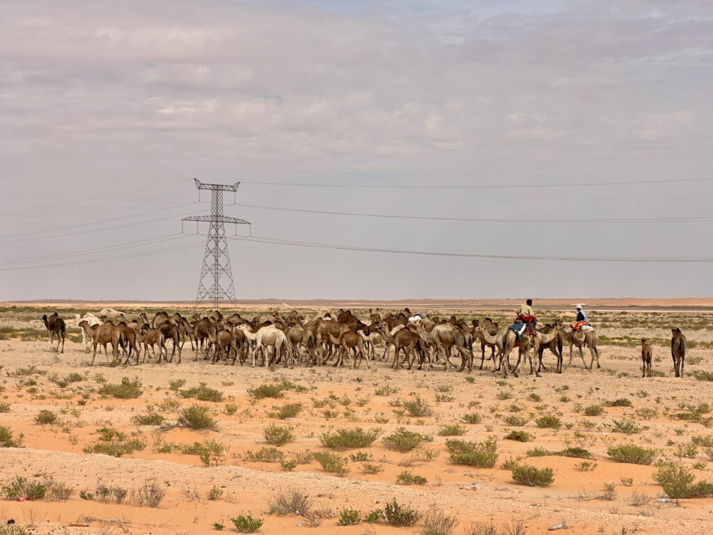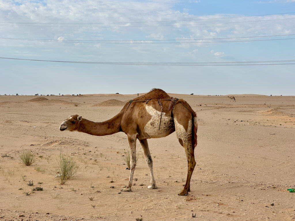 Heading out the landscape becomes more like classic Sahara as in the pictures, sand dunes and lots of camels, some roaming free, others herded or kept within catching distance by having their front legs tied.