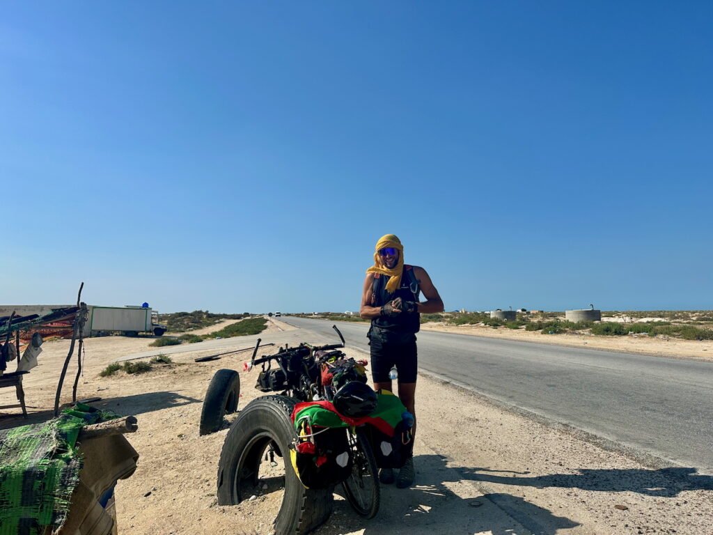 In total it’s taken just over two hours to get through the border. We head to the first town, Boulenoire, or as google maps has it, Bon Lanouar, about 60 km away. Leo messages that he’s had his bike fixed and should meet us there in a couple of hours. The desert is different this side, there are spots with trees and other vegetation, and places where people live out here. The headwind is strong and the sun hot, so after several stops I reach Boulenoir at about three.