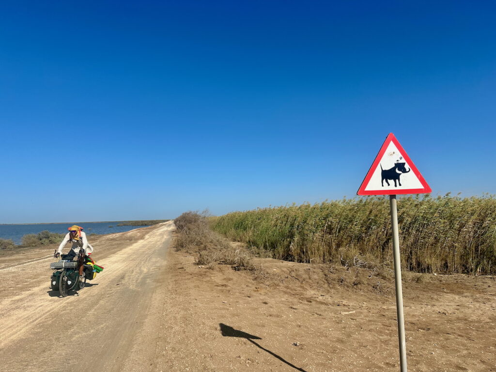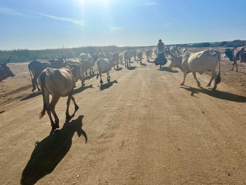 We get coffee where the road forks for Rosso or Dawling National Park. Like in Eastern Europe, nescafé is considered posh coffee and that’s what we’re offered. We head into the park and, as expected, the road quickly deteriorates to packed sand and baked mud, deeply rutted in parts. We’re passed by a number of Portuguese motorcyclists, apparently there’s a Portugal-Dakar rally expected to arrive in the next day or so. Apart from that we spend the next few hours in the company of warthogs, great egrets, lots of different wading birds and some long-horn cattle. The road is tough to ride and the sun here is intense. It’s a different kind of heat than in Turkey or Europe, there it was very hot air like being in an oven, here it’s much more radiant heat.