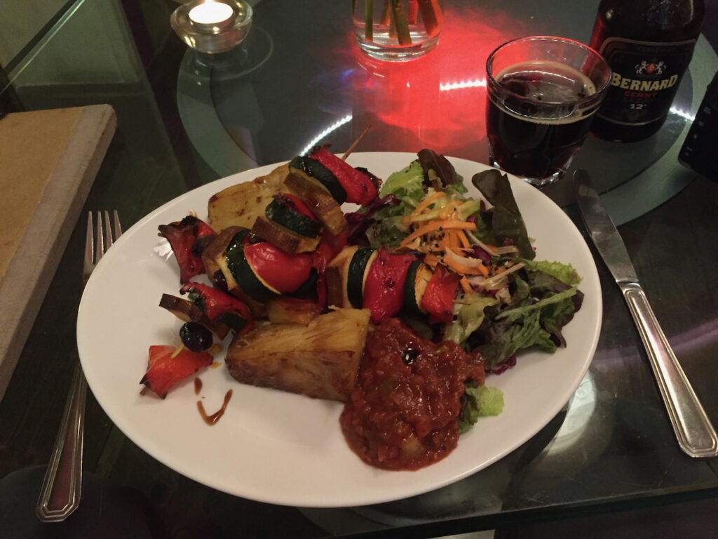 Czech food is very meat-heavy, and most non-meat options are cheese. A popular, but widely derided, non-meat dish is “fried cheese”. Cabbage and potato-based dishes can be had, and are much more interesting than they sound. Many bars serve Hermelín, you may have to ask for it, it’s a pickled cheese and can be excellent.